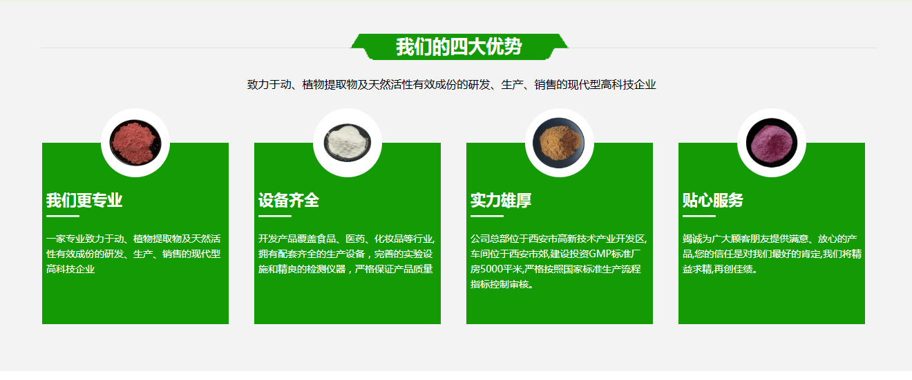 公司拥有完善的提取、分离、精制干燥设备和技术,主营业务为天然植物、中药材提取、医药中间体研制、开发,技术咨询,技术服务的生产与销售。产品远销欧美、东南亚、日本及澳洲等众多国家和地区,深受客户好评和信赖。